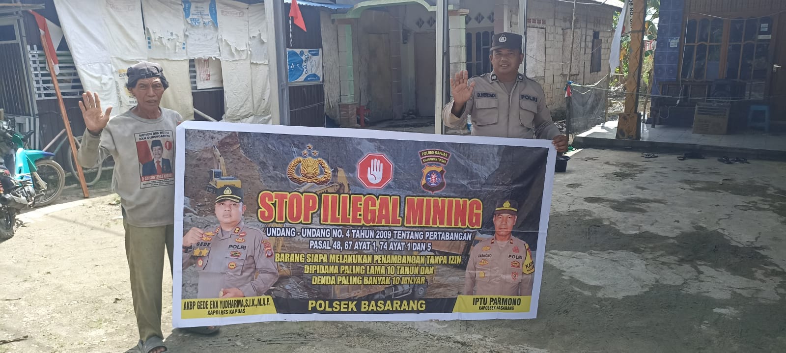 Polsek Basarang, Polres Kapuas jajaran Polda Kalteng – Cegah penambangan liar personil Polsek Basarang menggunakan spanduk sosialisasi stop Ilegal Mining kepada warga di Desa Tambun Raya Kecamatan Basarang Kabupaten Kapuas, Kamis (16/10/2025).
