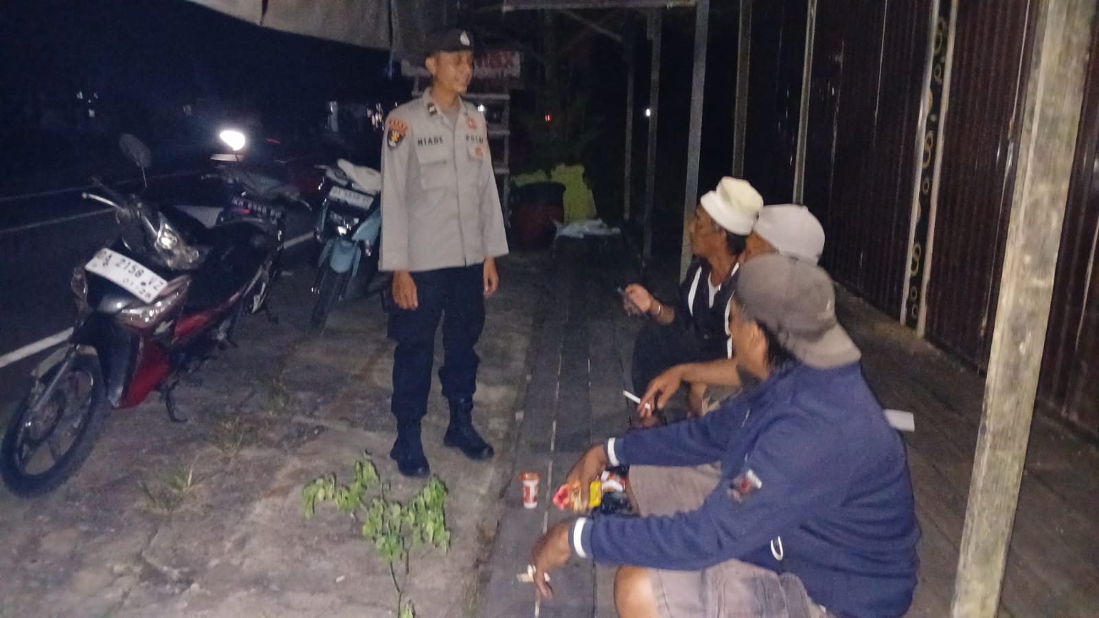 Terlihat saat patroli malam, anggota piket Polsek Pulau Petak melakukan patroli di warung warung kecil dan pemukiman penduduk Kecamatan Pulau Petak, Sabtu (18/10/2025) Malam
