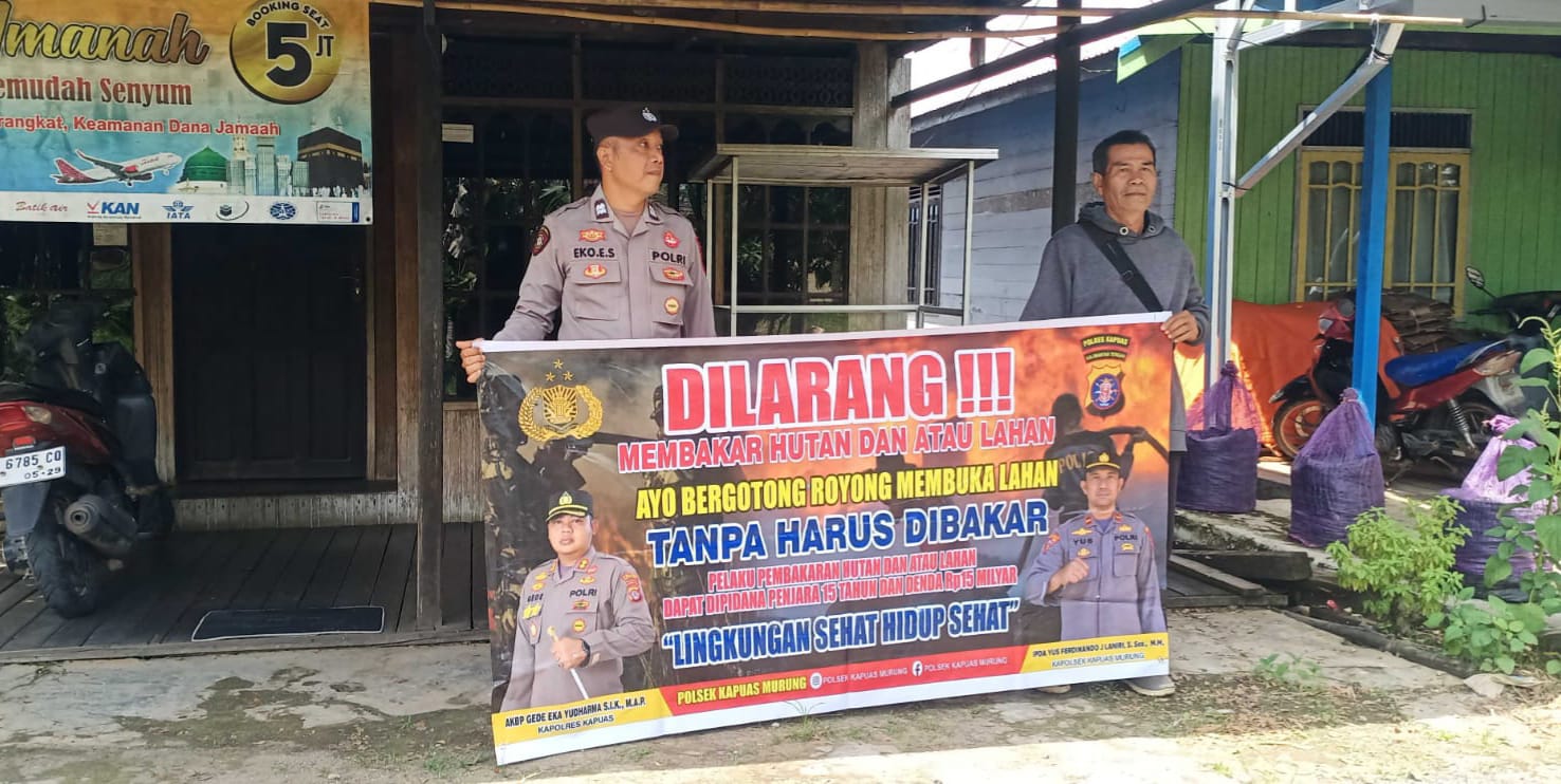 Bentang Sepanduk Larangan Membakar Hutan Dan Lahan Personil Polsek Kapuas Murung Melalui Giat Sosialisasi Karhutla