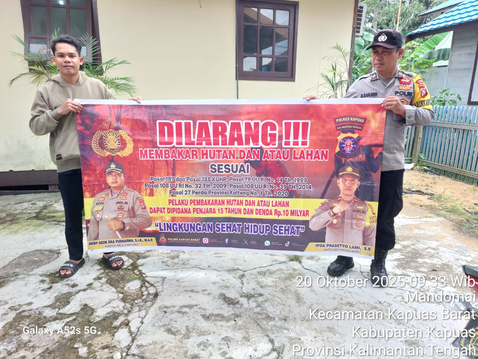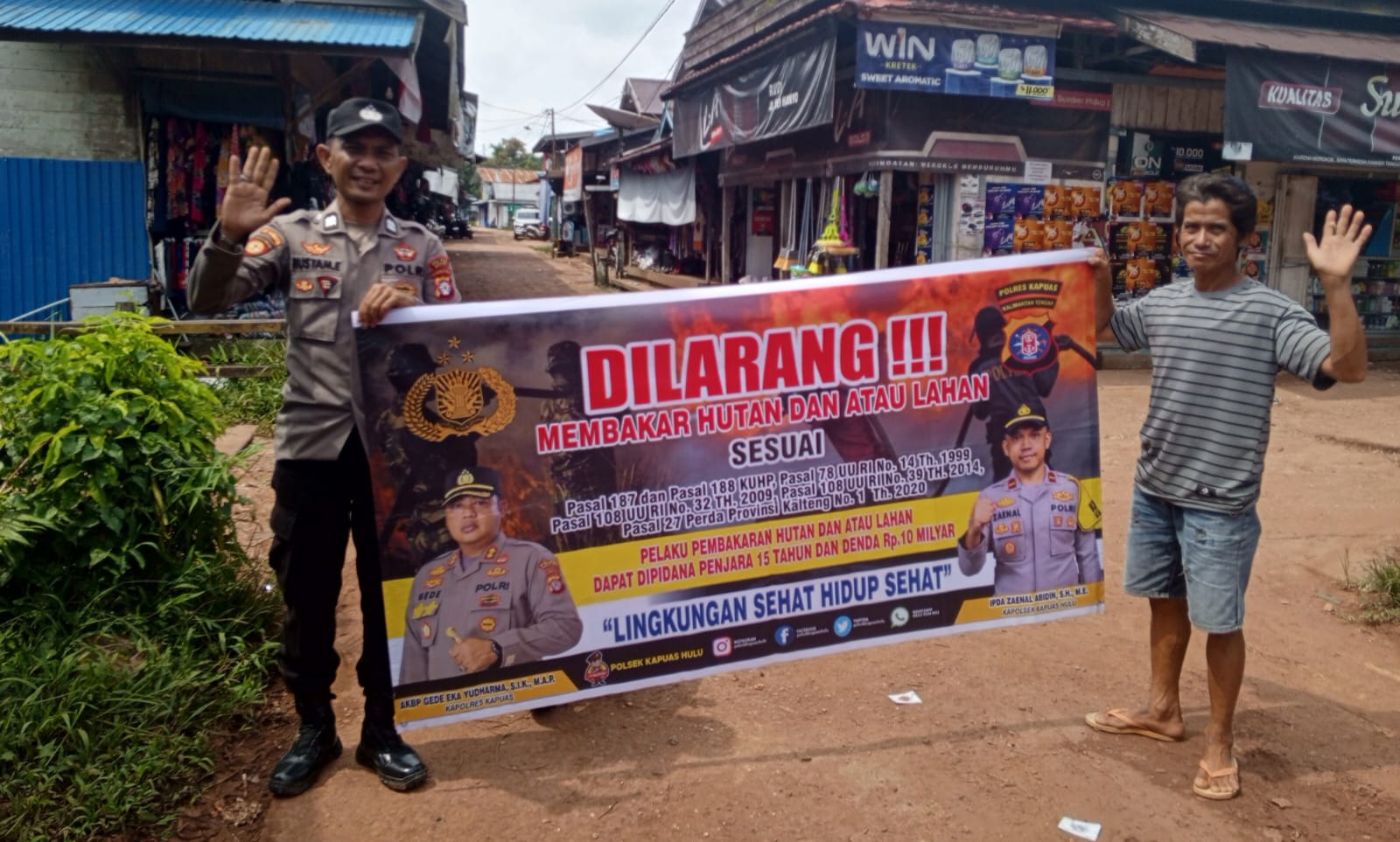 Dalam upaya mencegah terjadinya kebakaran hutan dan lahan (Karhutla), personel Polsek Kapuas Hulu Polres Kapuas Polda Kalteng terus gencar memberikan imbauan kepada masyarakat agar tidak melakukan aktivitas pembakaran lahan saat membuka kebun atau membersihkan lahan pertanian.