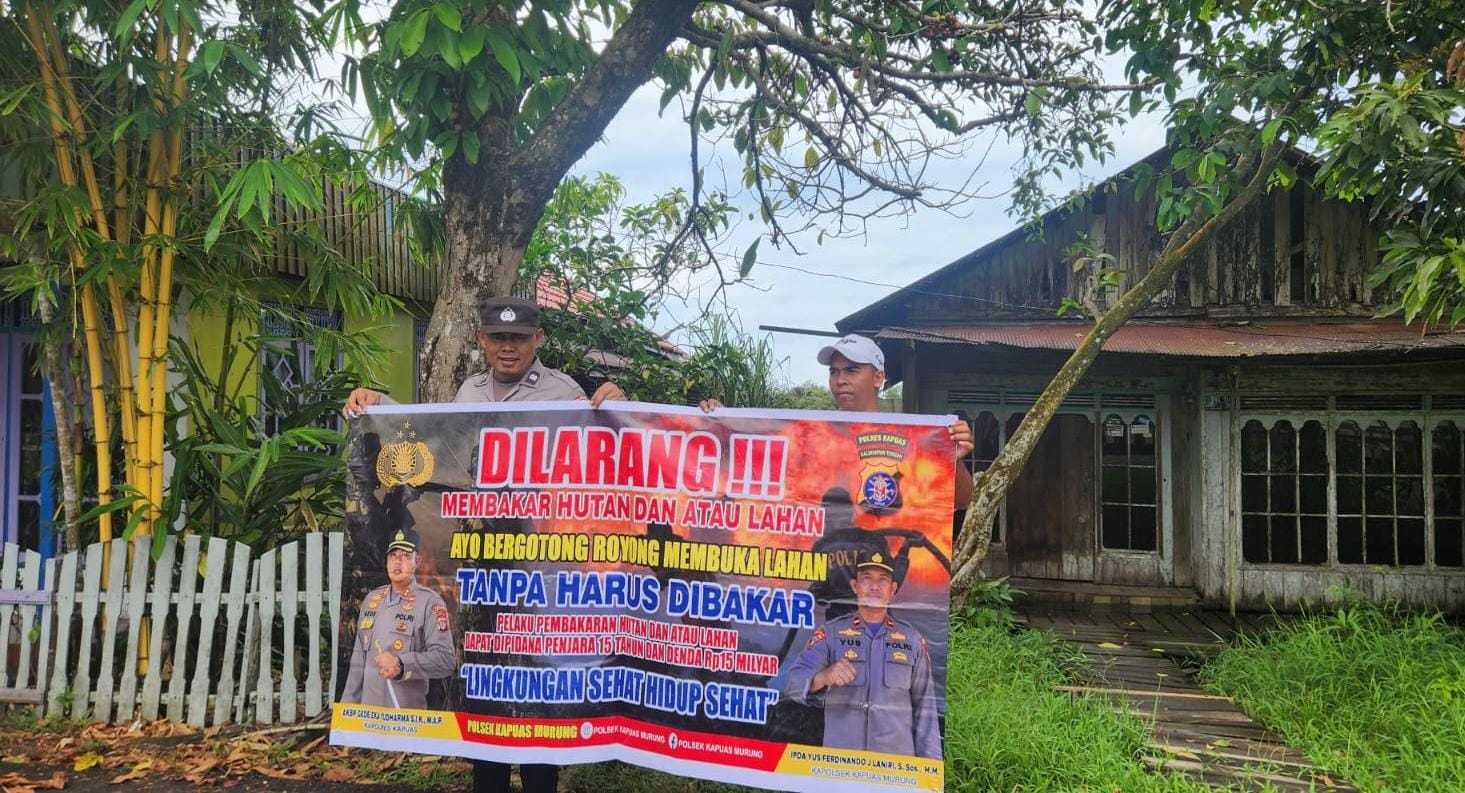 Bentang Sepanduk Larangan Membakar Hutan Dan Lahan Personil Polsek Kapuas Murung Melalui Giat Sosialisasi Karhutla