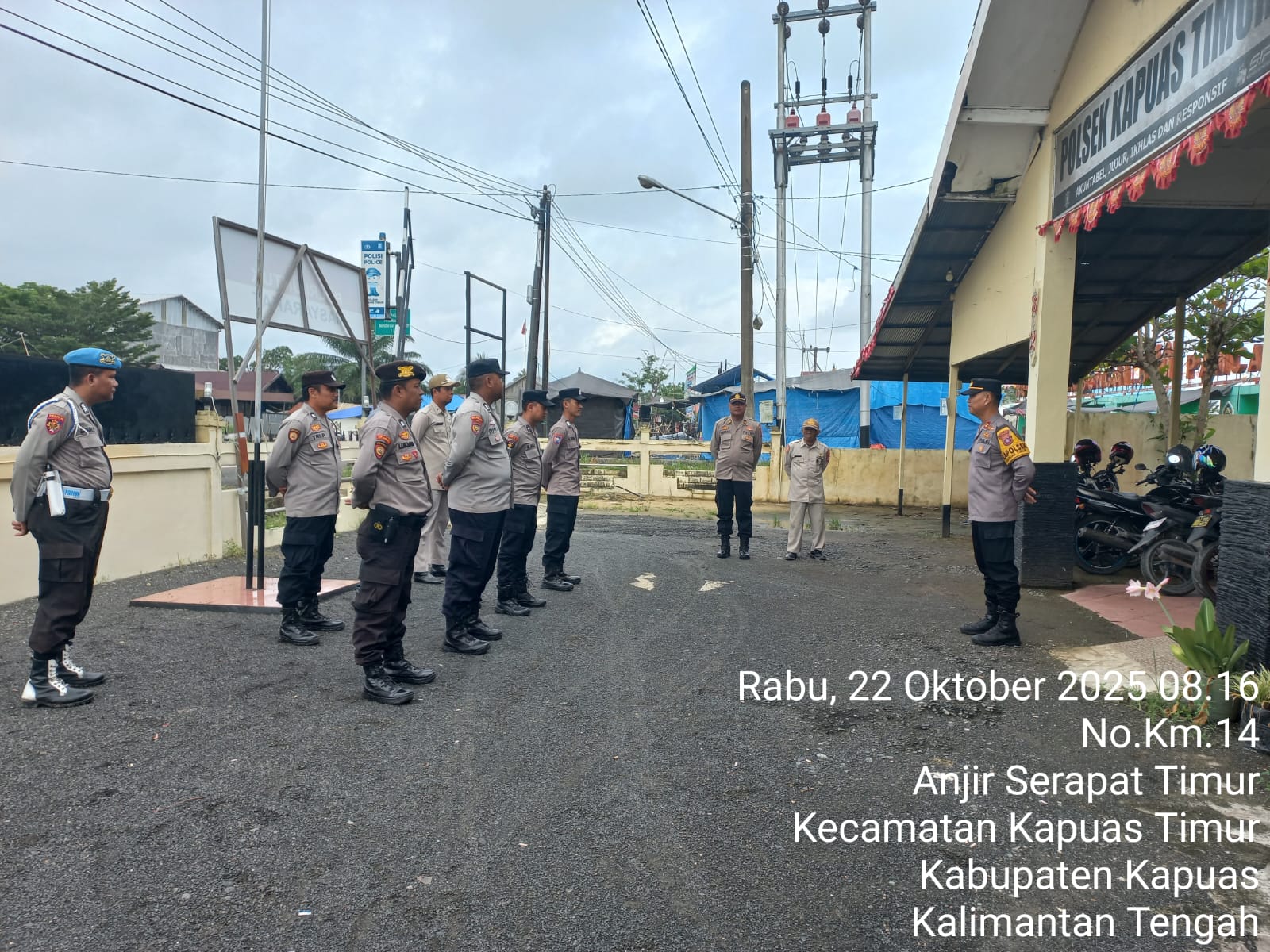 Kapuas Timur-Apel pagi yang diikuti personel Polsek Kapuas Timur Polres Kapuas di laksanakan dalam rangka kesiapsiagaan anggota dalam menghadapi sitkamtibmas. Apel pagi Polsek Kapuas Timur kali ini langsung dipimpin oleh Kapolsek Kapuas Timur Iptu Gendee, S.H., M.A., bertempat di halaman mako Polsek Kapuas Timur Jalan Trans Kalimantan Km. 14 Kecamatan Kapuas Timur, Rabu (22/10/2025) pukul 07.30 Wib.