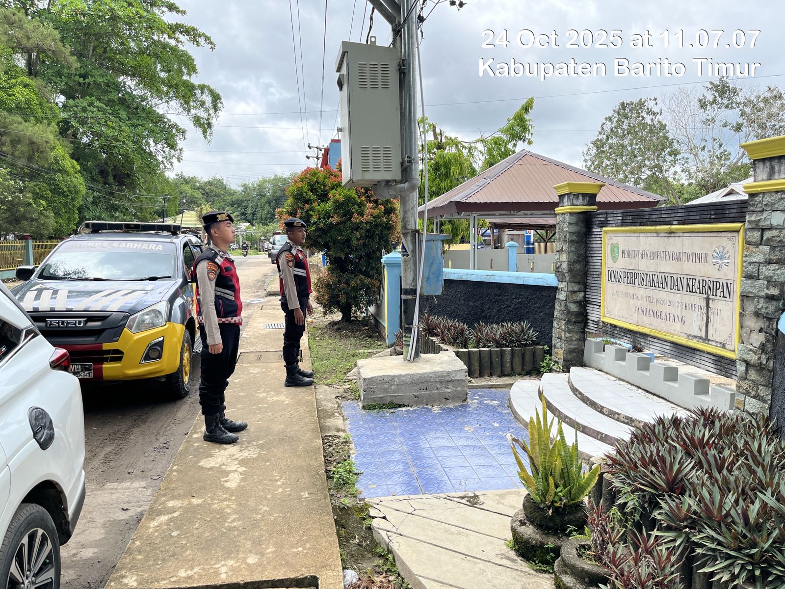 Barito Timur, 24 Oktober 2025 – Satsamapta Polres Barito Timur- Polda Kalteng melaksanakan kegiatan Patroli Kota Presisi dengan pendekatan sambang ke lingkungan Dinas Perpustakaan & Kearsipan Kabupaten Barito Timur, yang berlokasi di Jl. Nansarunai, Kelurahan Tamiang Layang, Kecamatan Dusun Timur. Kegiatan ini bertujuan untuk menciptakan Cipta Kondisi Aman, sekaligus membangun sinergi dengan pegawai dan petugas keamanan internal di kantor pemerintahan tersebut.