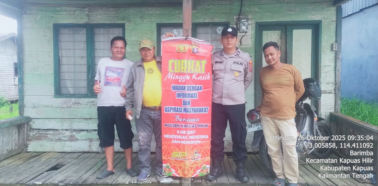Pada hari minggu Warga dengan senang hati menerima anggota Polsek kapuas hilir, bahwa kehadiran Polsek Kapuas Hilir ditengah warga dan menunjukkan Program Quick Wins Presisi Polri untuk memberikan pelayanan, perlindungan, pengayoman secara langsung untuk mendengar informasi dan aspirasi masyarakat terkait hal-hal gangguan kamtibmas yang belum tersalurkan sebagai penyampaian terhadap pimpinan Polri.