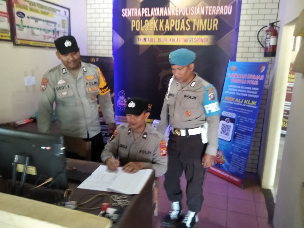 Kali ini personel Polsek Kapuas Timur melaksanakan serah terima tugas penjagaan dari SPKT lama kepada SPKT baru di mapolsek Kapuas Timur guna kesiapan personel jaga dan pengecekan barang inventaris dinas, Senin (27/10/2025) pukul 08.00 WIB.