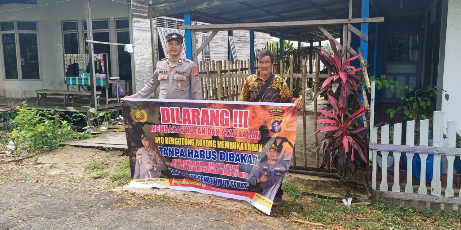 Bentang Sepanduk Larangan Membakar Hutan Dan Lahan Personil Polsek Kapuas Murung Melalui Giat Sosialisasi Karhutla