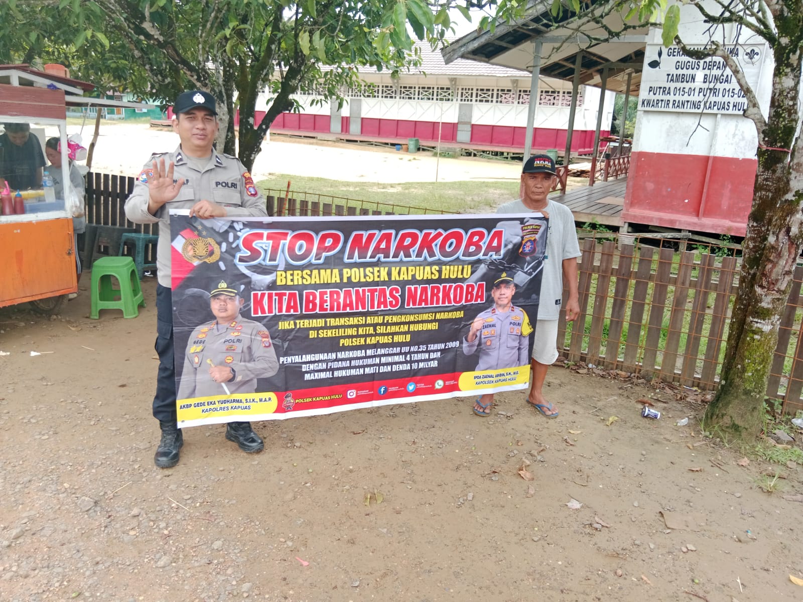Tribratanews.kalteng.polri.go.id-Kapuas Hulu-Dalam upaya meningkatkan pencegahan dan penanggulangan penyalahgunaan narkoba, Polsek Kapuas Hulu telah melaksanakan imbauan melalui media spanduk bertuliskan “Stop Narkoba” di beberapa lokasi yang dianggap rawan tindak pidana narkoba yang dilaksanakan oleh Aipda Simpang L. S. Purba dan Aiptu Karyadi, S.Sos, bertempat di Desa Sei Hanyo Kecamatan Kapuas Hulu Kapuas Hulu Kabupaten Kapuas Provinsi Kalimantan Tengah, Rabu (19/11/2025) pukul 13.45 WIB