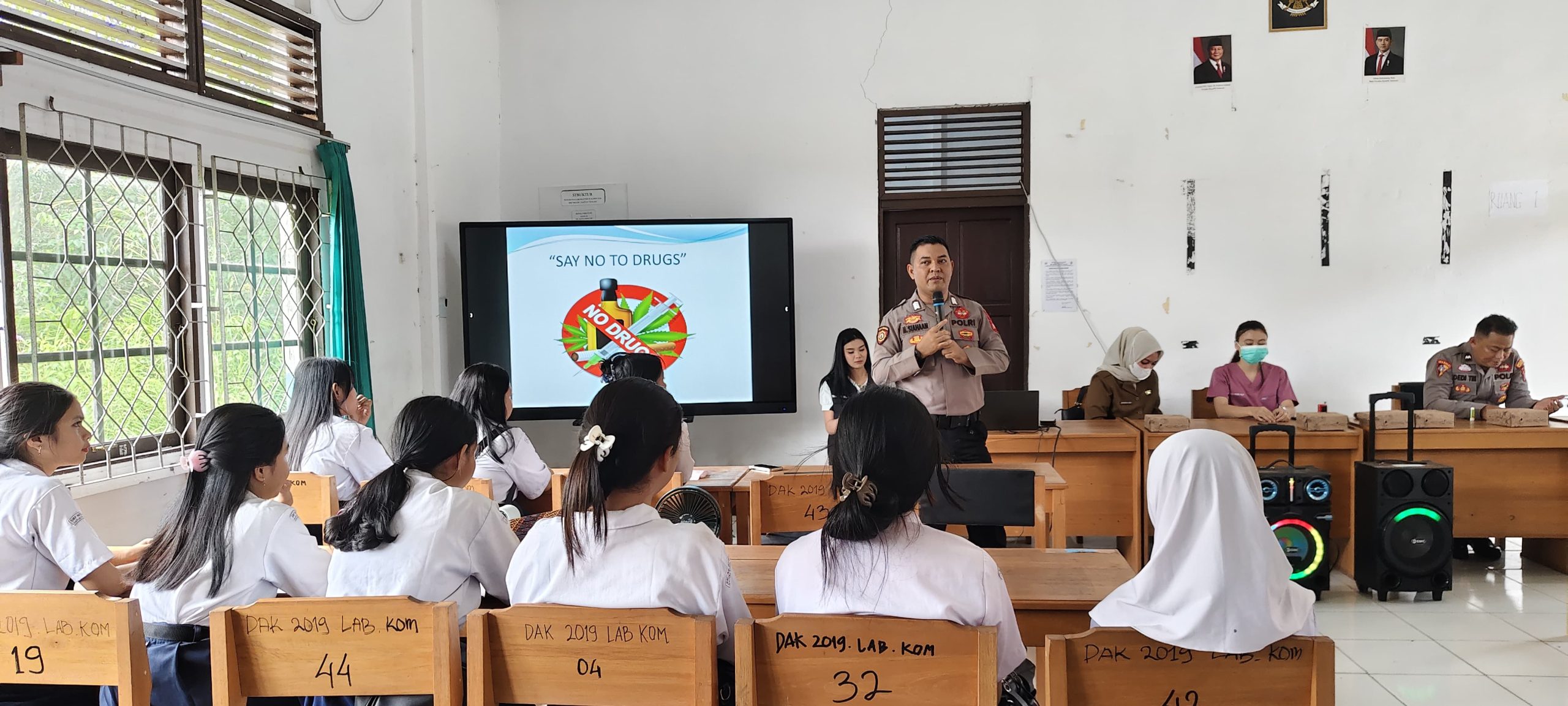 PERSONEL POLSEK KAPUAS TENGAH SOSIALISASI DAN PENYULUHAN TENTANG BAHAYA PENYALAHGUNAAN NARKOBA DAN DAMPAK PERNIKAHAN DINI DI SMPN 1 KAPUAS TENGAH