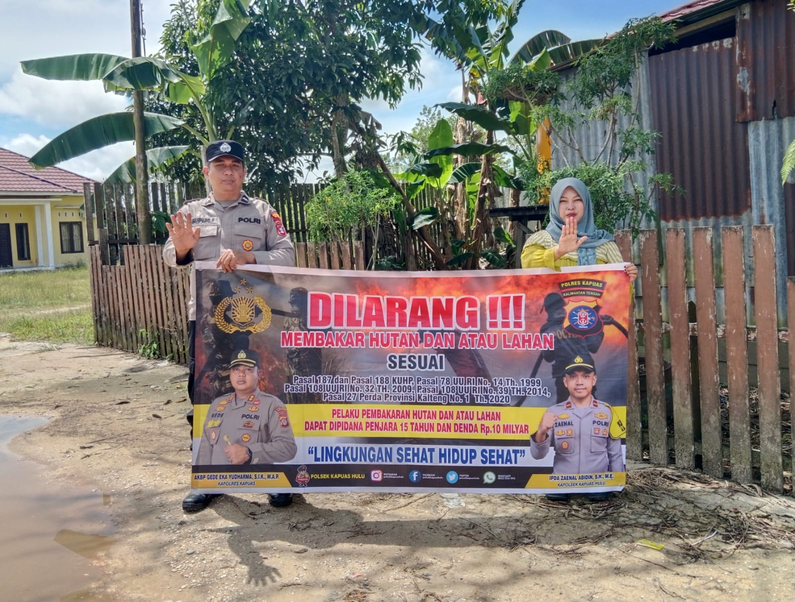 Tribratanews.kalteng.polri.go.id-Kapuas Hulu-Guna mencegah terjadinya kebakaran hutan dan lahan (Karhutla), personel Polsek Kapuas Hulu gencar memberikan imbauan kepada masyarakat, seperti pada Selasa, (25/11/2025) pukul 11.35 Wib, personel Polsek Kapuas Hulu Aipda Simpang L. S. Purba dan Bripda Yoski Yosan D. S., melaksanakan sosialisasi stop membakar hutan dan lahan dengan cara membentangkan spanduk atau benner tentang imbauan larangan membuka lahan dengan cara dibakar bersama-sama dengan warga masyarakat di Desa Sei Hanyo Kecamatan Kapuas Hulu Kabupaten Kapuas Provinsi Kalteng.