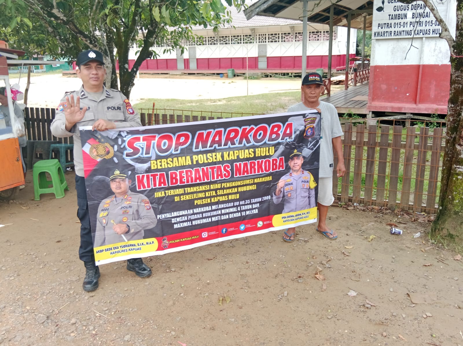 Tribratanews.kalteng.polri.go.id-Kapuas Hulu-Dalam upaya meningkatkan pencegahan dan penanggulangan penyalahgunaan narkoba, personel Polsek Timur Polres Kapuas jajaran Polda Kalteng Aipda Simpang L. S. Purba dan Bripda Yoski Yosan D. S., rutin melaksanakan sosialisasi telah melaksanakan imbauan melalui media spanduk bertuliskan “Stop Narkoba” di beberapa lokasi yang dianggap rawan tindak pidana narkoba. Bertempat di Desa Sei Hanyo Kecamatan Kapuas Hulu Kapuas Hulu Kabupaten Kapuas Provinsi Kalimantan Tengah, Selasa (25/11/2025) pukul 10.25 WIB
