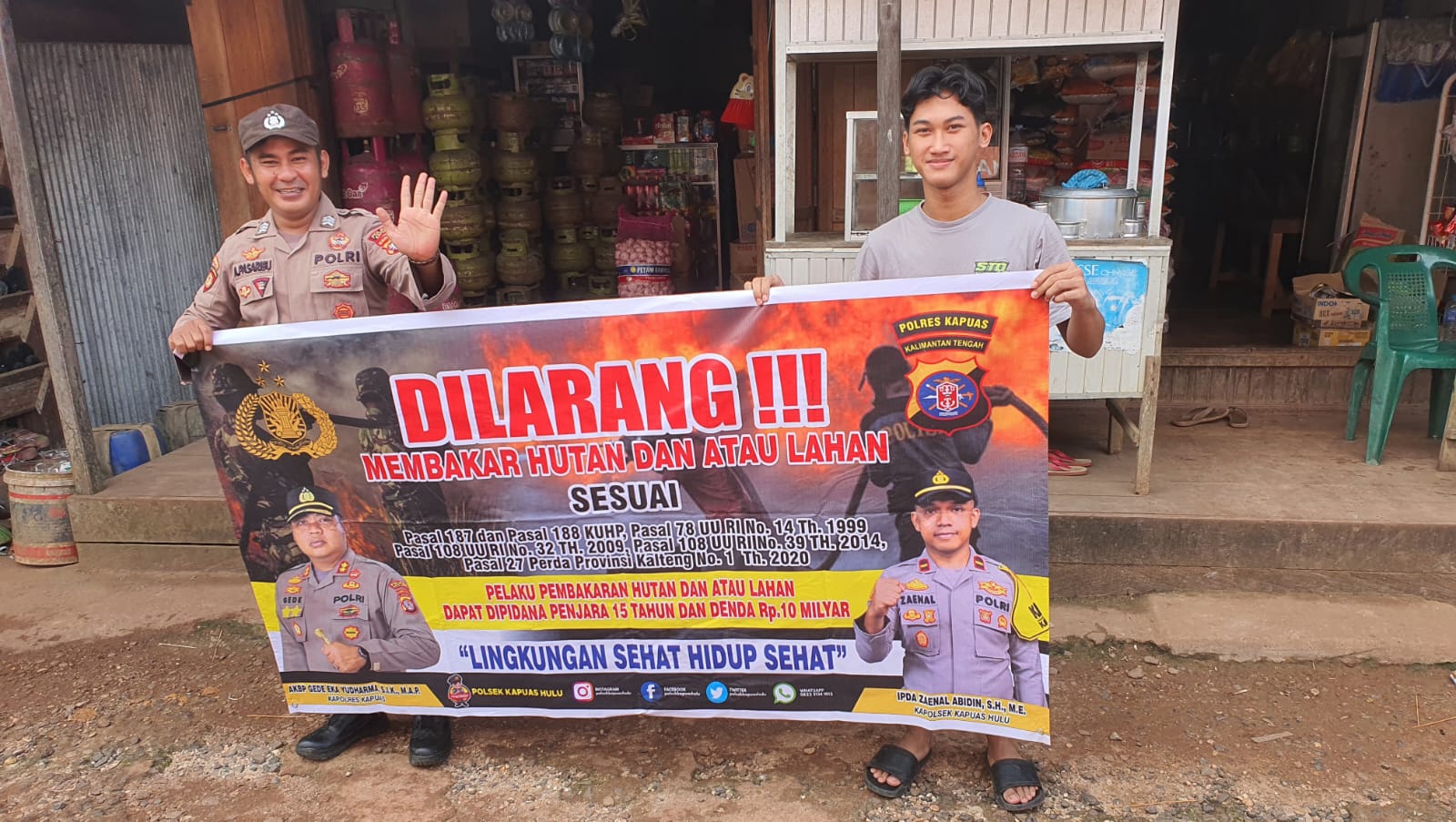 Tribratanews.kalteng.polri.go.id-Kapuas Hulu-Kegiatan sosialisasi dan imbauan larangan membakar hutan dan lahan dengan menggunakan spanduk yang berisi tentang sanksi dan pidana buka lahan dengan cara membakar, sesuai dengan pasal 187 dan pasal 188 KUHP, pasal 78 UU RI Nomor 41 Tahun 1999 tentang kehutanan, pasal 99 ayat (1), pasal 108, pasal 116, pasal 118, dan pasal 119 UU RI Nomor 32 Tahun 2009 tentang lingkungan hidup, pasal 108 UU RI Nomor 39 Tahun 2014 tentang perkebunan, pasal 27 Perda Prov. Kalteng Nomor 1 Tahun 2020 tentang pengendalian karhutla, pelaku pembakaran lahan dan hutan dapat di pidana penjara 15 Tahun dan denda 15 milyar rutin dilaksanakan oleh personel Polsek Kapuas Hulu Polres Kapuas jajaran Polda Kalteng Aipda Imanuel P. Nadeak dan Brigpol A. Pasaribu.