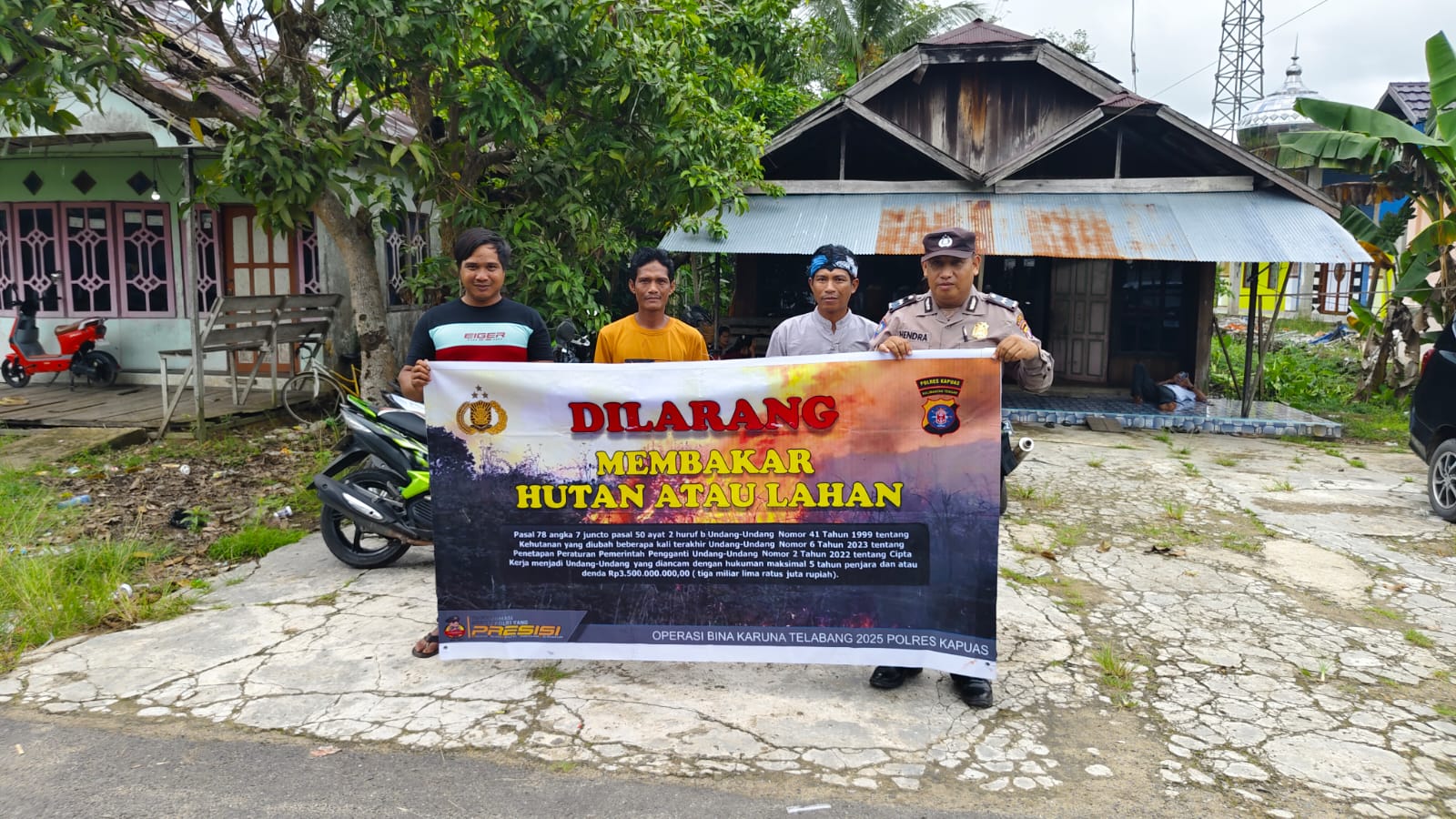 Bentang Sepanduk Larangan Membakar Hutan Dan Lahan Personil Polsek Kapuas Murung Melalui Giat Sosialisasi Karhutla