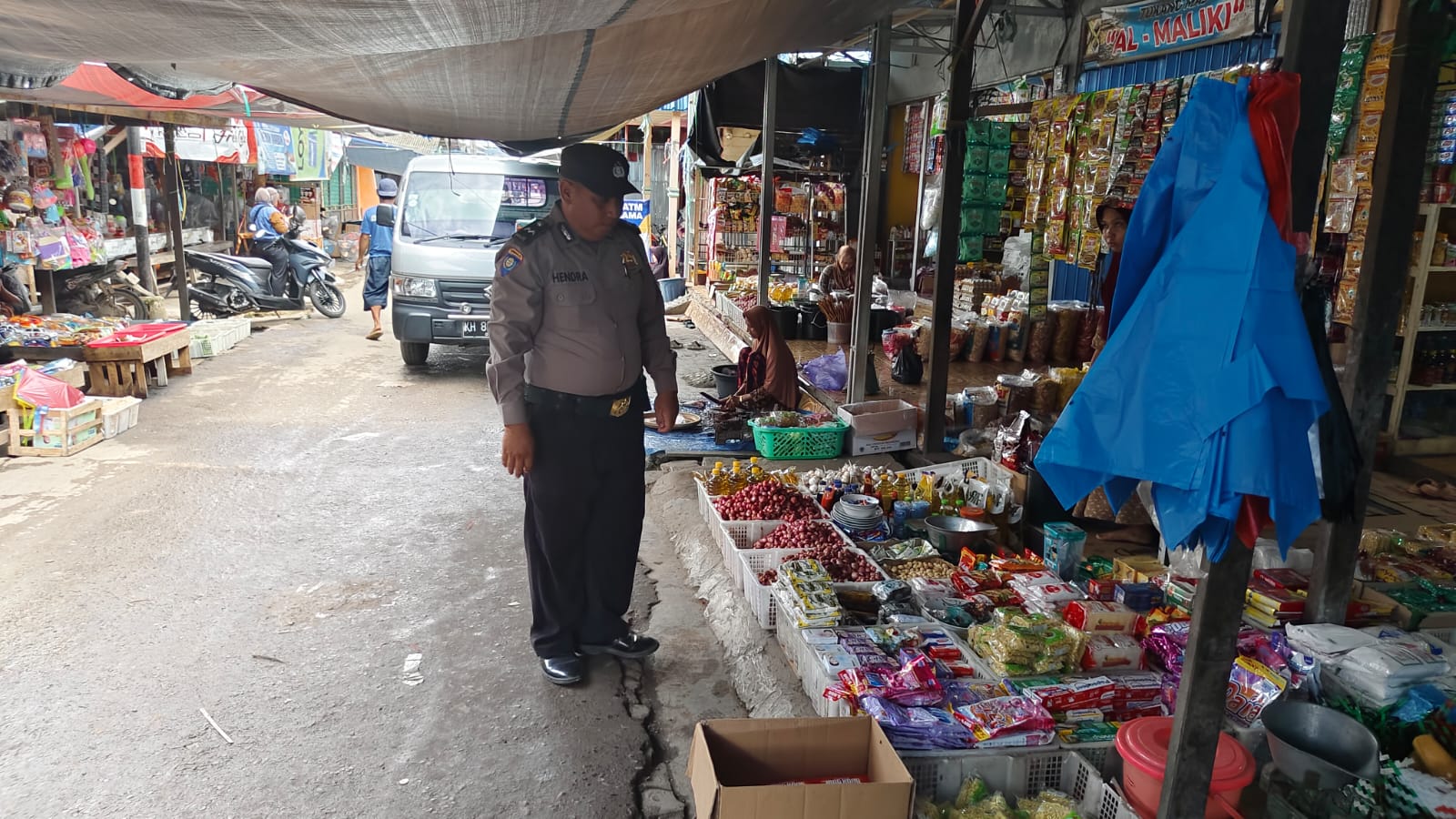 Aipda Siswanto melaksanakan patroli untuk memberikan rasa aman di hati masyarakat yang beraktifitas di komplek pasar.