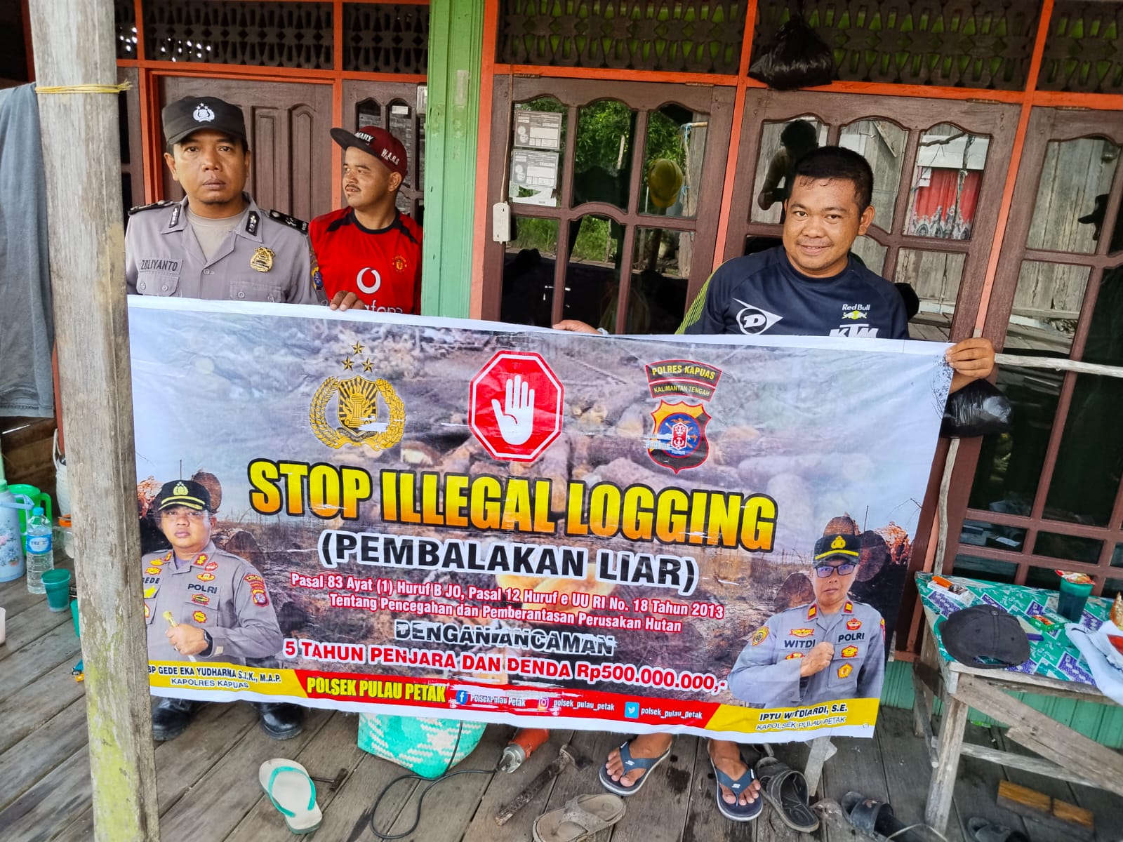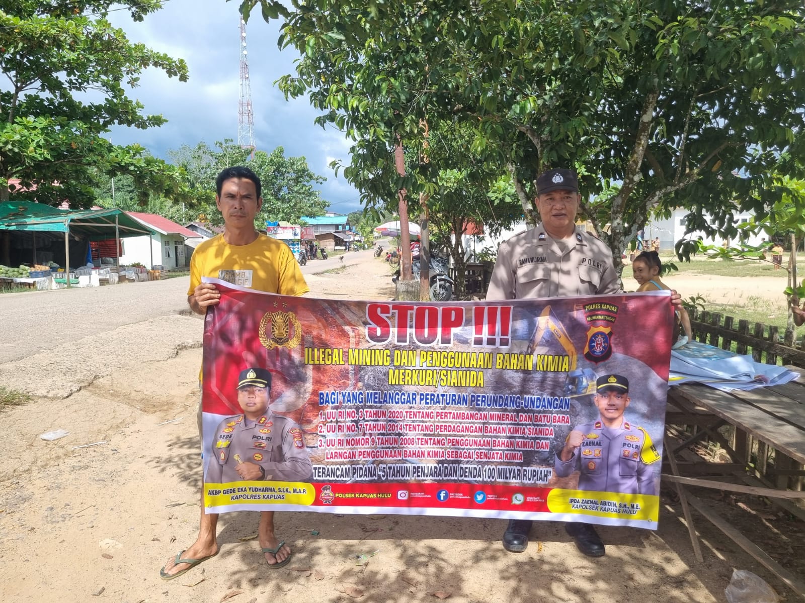 “Personel Polsek Kapuas Hulu membentangkan pamflet bertuliskan stop illegal mining serta sanksi pidana RI nomor 3 tahun 2020 tentang pertambangan mineral dan batubara, undang-undang RI nomor 7 tahun 2014 tentang perdagangan bahan kimia/sianida, dan undang-undang RI nomor 9 tahun 2008 tentang penggunaan bahan kimia sebagai senjata kimia dengan ancaman pidana penjara selama 5 tahun dan denda 100 milyar rupiah serta memberikan himbauan bersama-sama dalam menanggulangi illegal mining apabila mendengar, melihat suatu kegiatan penambangan iIlegal agar segera melaporkannya ke Polsek Kapuas Hulu atau bisa melaporkannya kepada Bhabinkamtibmas atau Polmas untuk segera di tindak lanjuti”. tegas Kapolsek. (@13)