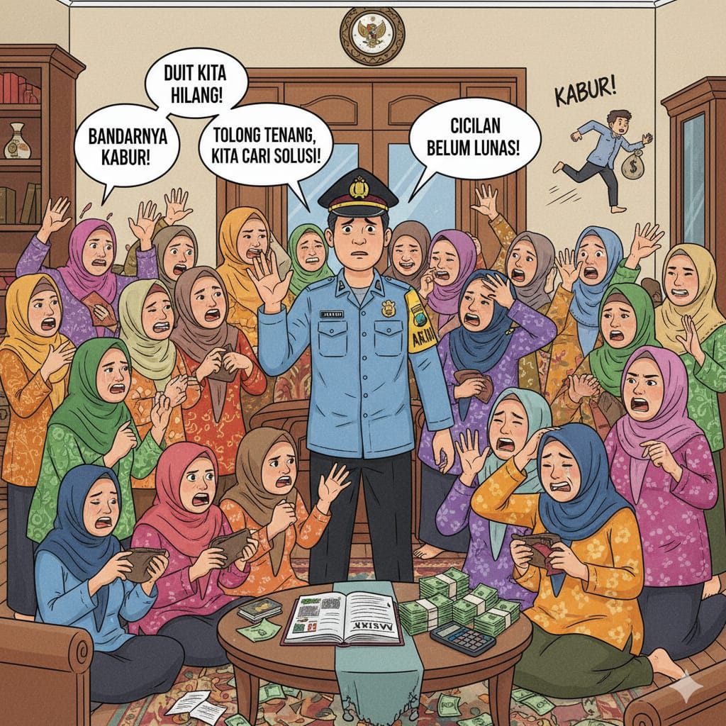 Palangka Raya – 42 ibu rumah tangga (IRT) warga Kota Palangka Raya curhat ke Cak Sam Polda Kalteng karena Bunga (25) warga Kota Palangka Raya bandar arisan kabur entah kemana membawa uang Rp 300 jutaan.