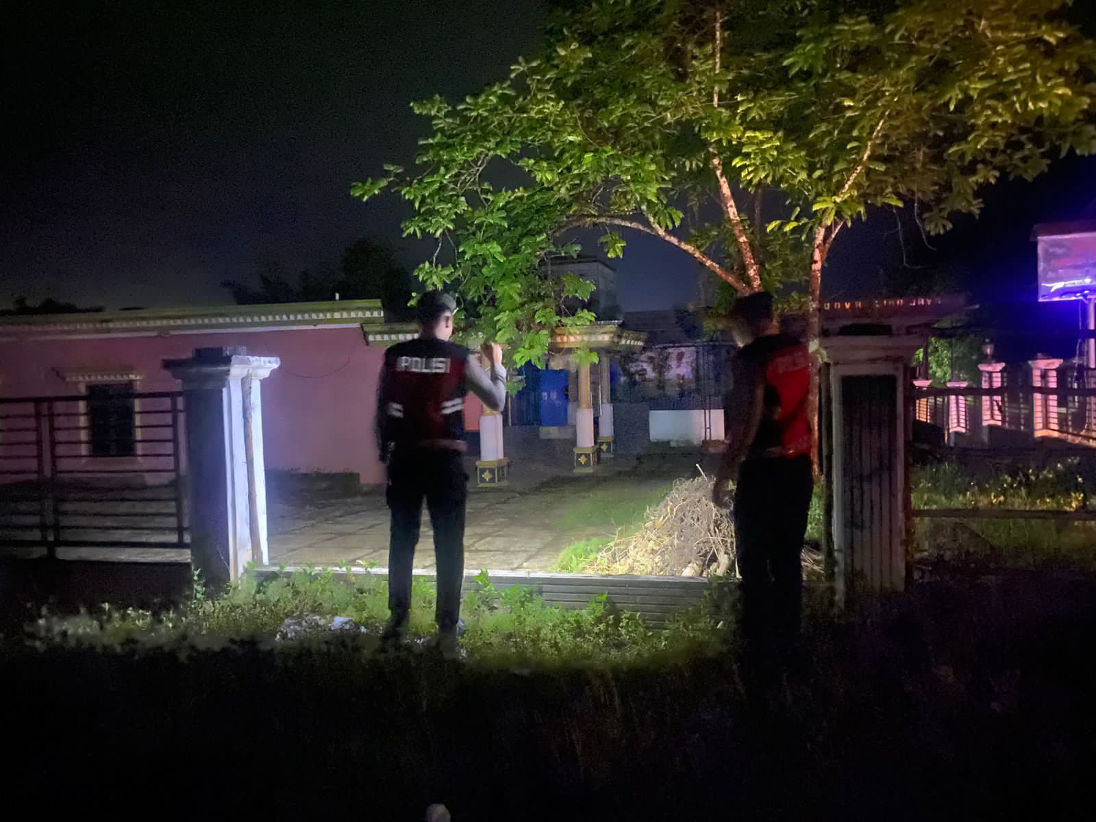Petugas memeriksa kondisi sekitar bangunan untuk mengantisipasi adanya aktivitas mencurigakan.