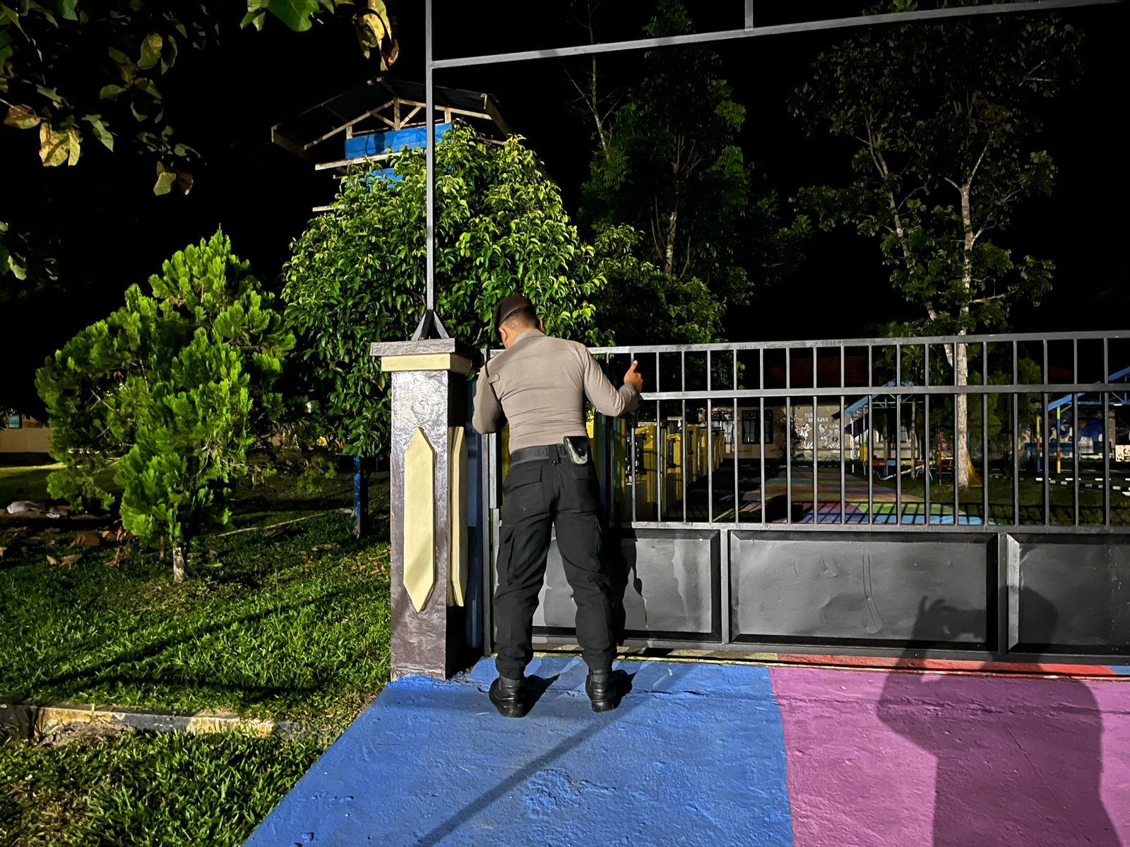 Petugas patroli juga memeriksa lampu-lampu penerangan di sekitar area TK Bhayangkari untuk memastikan bahwa semuanya berfungsi dengan baik.